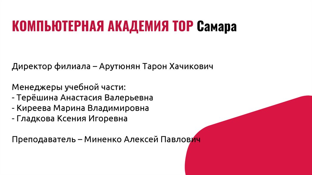 КОМПЬЮТЕРНАЯ АКАДЕМИЯ ТОР СамараДиректор филиала – Арутюнян Тарон Хачикович