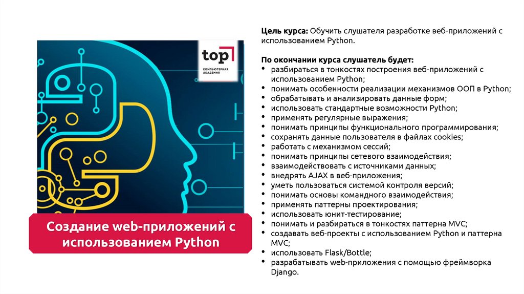 Цель курса: Обучить слушателя разработке веб-приложений cиспользованием Python.