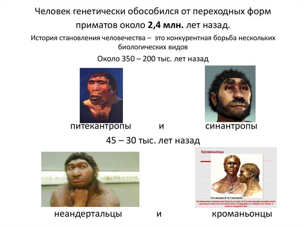 Человек генетически обособился от переходных формприматов около 2,4 млн. лет назад.