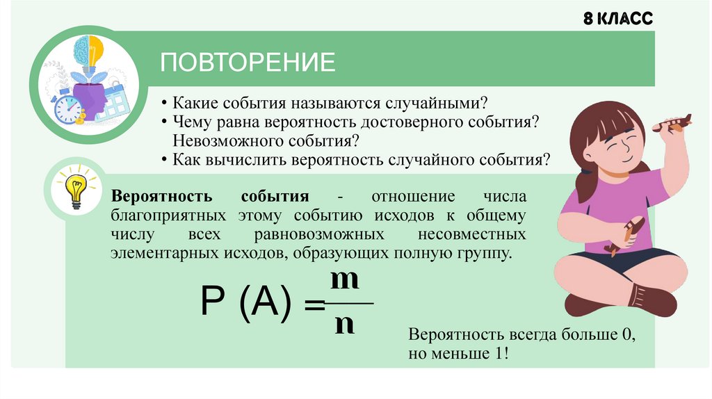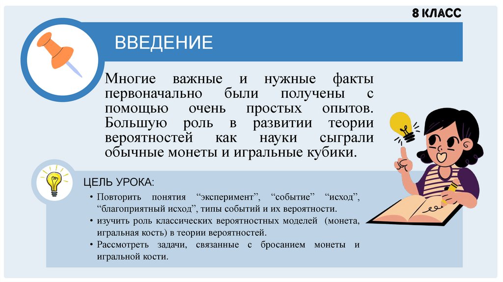 • Повторить понятия “эксперимент”, “событие” “исход”,