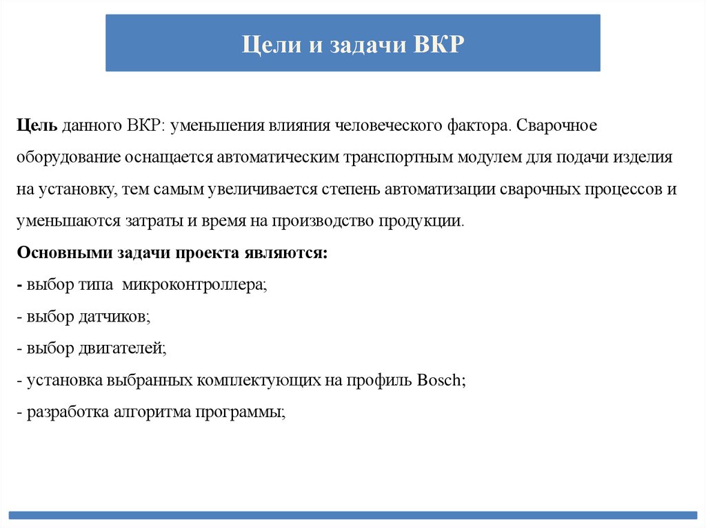 Цели и задачи ВКРЦель данного ВКР: уменьшения влияния человеческого фактора. Сварочное