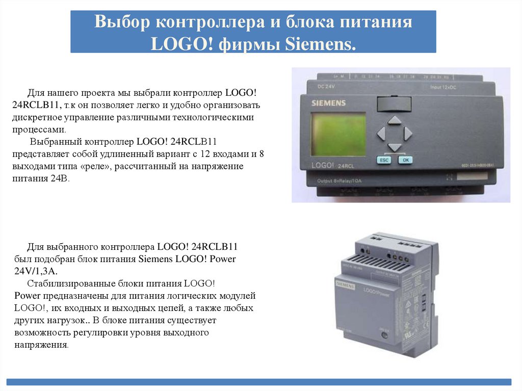 Выбор контроллера и блока питанияLOGO! фирмы Siemens.