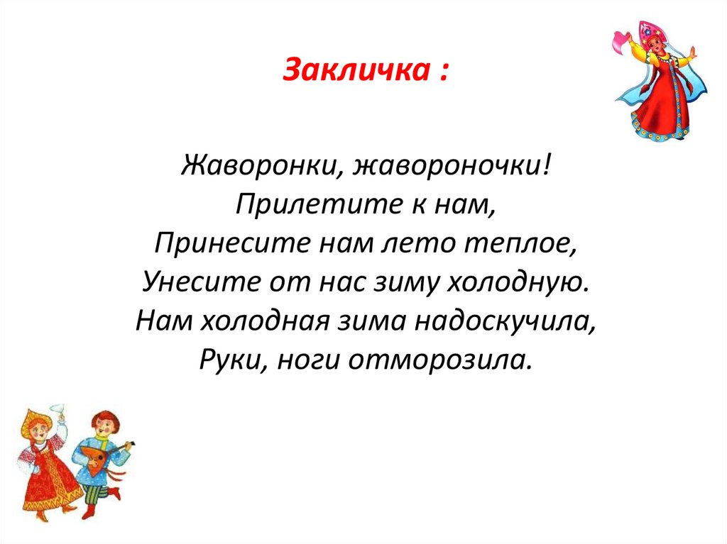 17. Закличка – короткое стихотворение, которое выкликали, участвуя в обрядах календарного цикла.