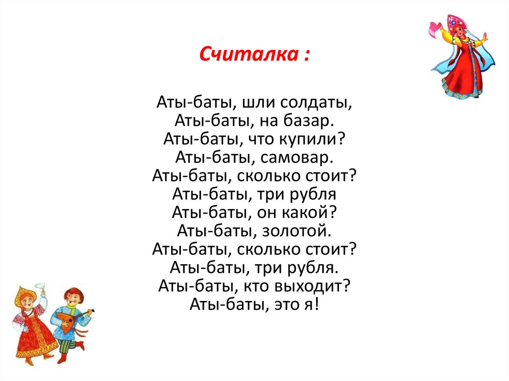 19. Считалка – короткий стишок, с помощью которого определяют, кто в игре водит.