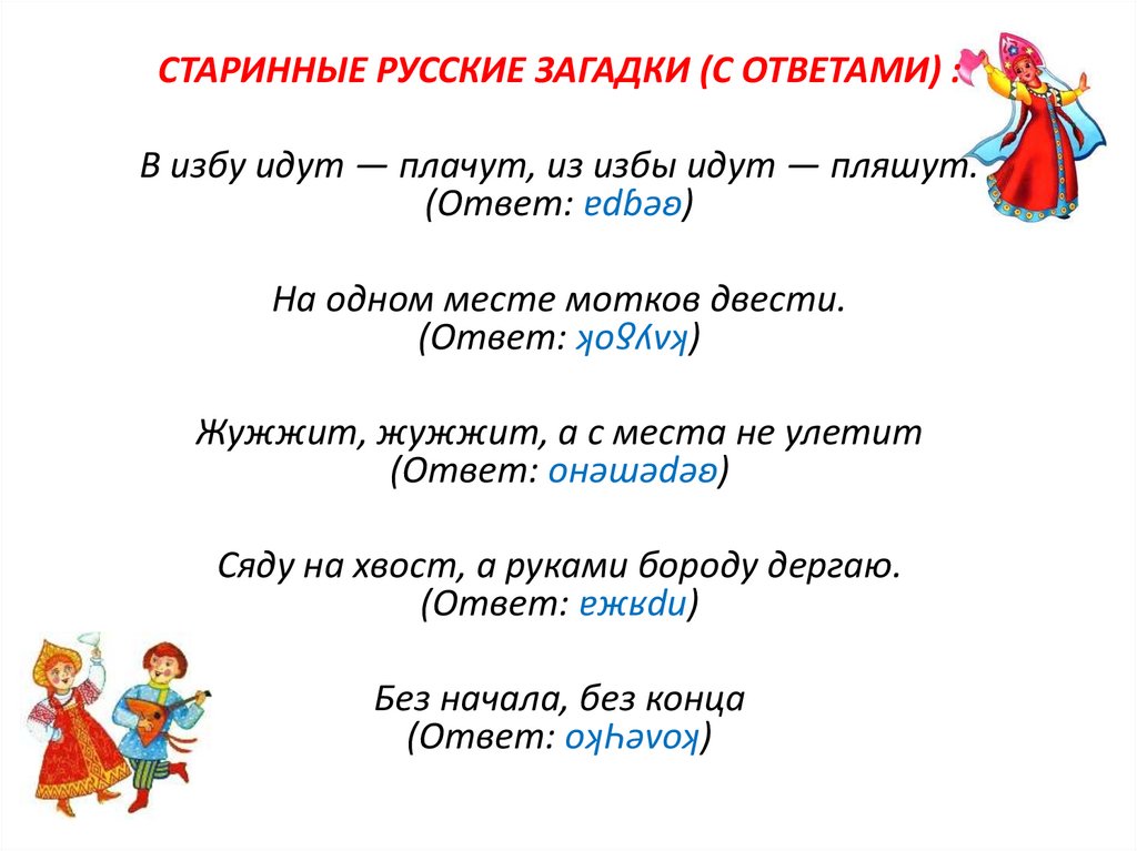 СТАРИННЫЕ РУССКИЕ ЗАГАДКИ (С ОТВЕТАМИ) :В избу идут — плачут, из избы идут — пляшут.