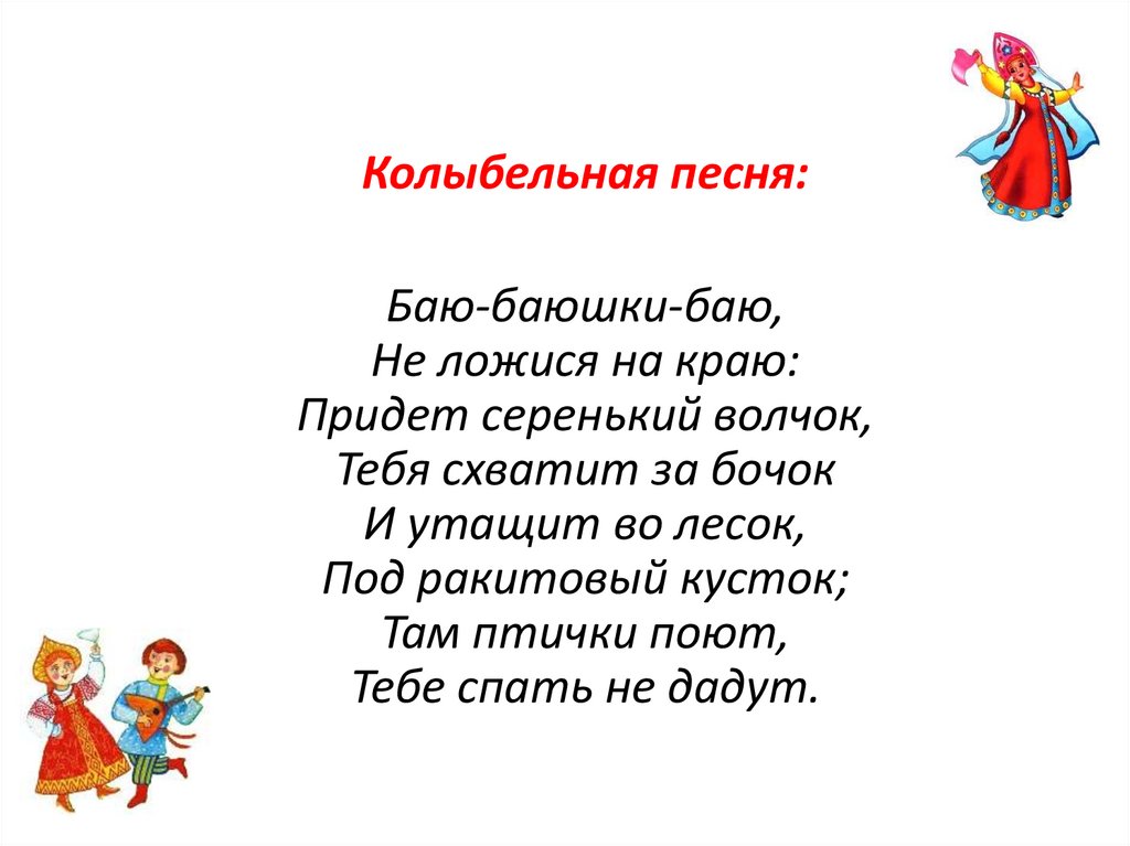 Колыбельная песня — один из древнейшихжанров фольклора, на что указывает тот факт,