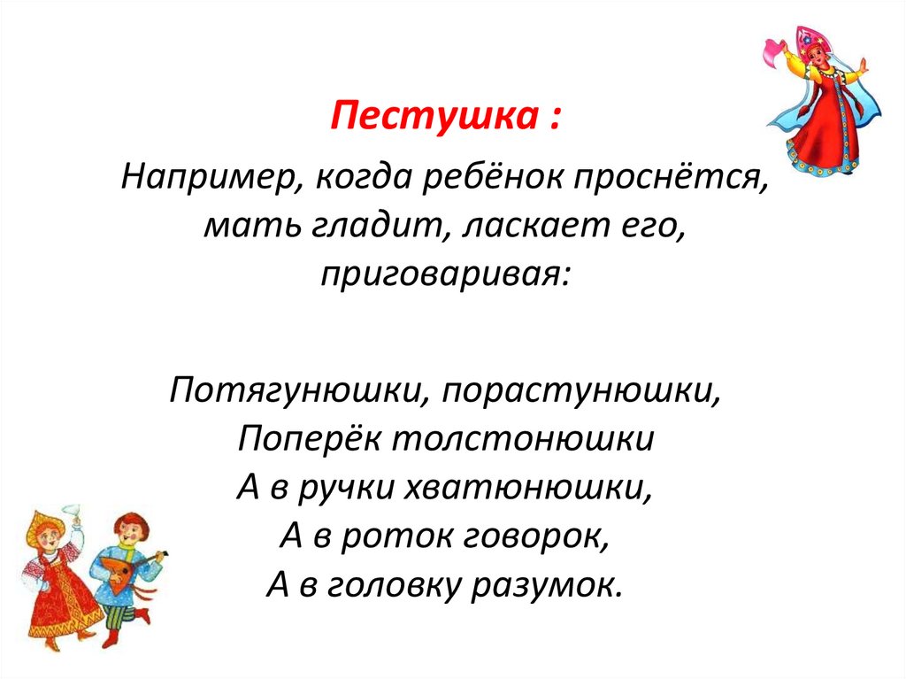 7. Пестушка – короткая стихотворная приговорка нянюшек и матерей, которые пестуют младенца.