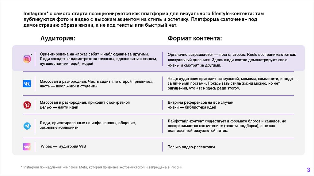 Instagram* с самого старта позиционируется как платформа для визуального lifestyle-контента: тампубликуются фото и видео с высоким акцентом на стиль и эстетику. Платформа «заточена» под