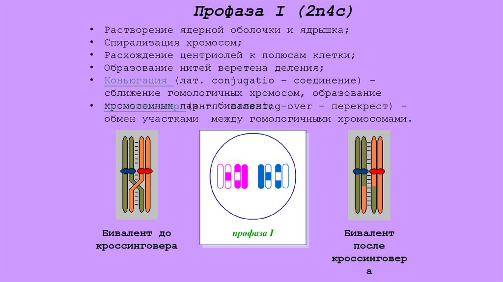 Профаза I (2n4c)Растворение ядерной оболочки и ядрышка;