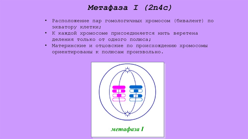 Метафаза I (2n4c)• Расположение пар гомологичных хромосом (бивалент) по