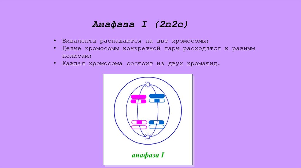 Анафаза I (2n2c)• Биваленты распадаются на две хромосомы;