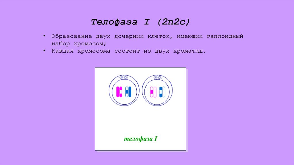 Телофаза I (2n2c)• Образование двух дочерних клеток, имеющих гаплоидный