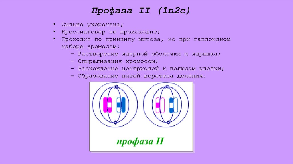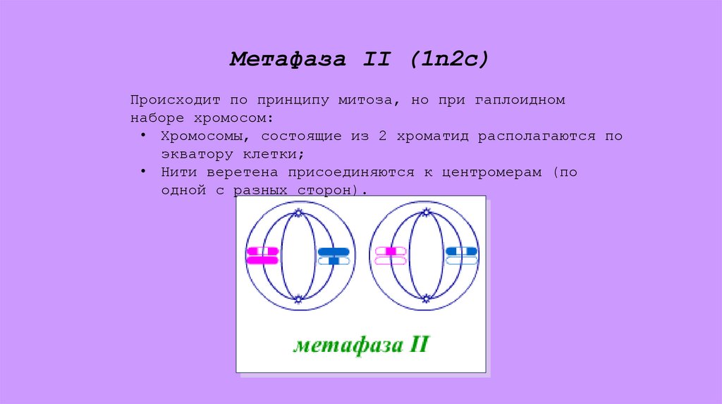 Метафаза II (1n2c)Происходит по принципу митоза, но при гаплоидном