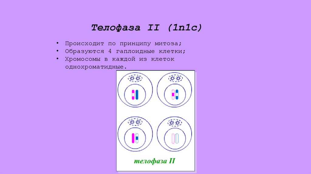 Телофаза II (1n1c)• Происходит по принципу митоза;