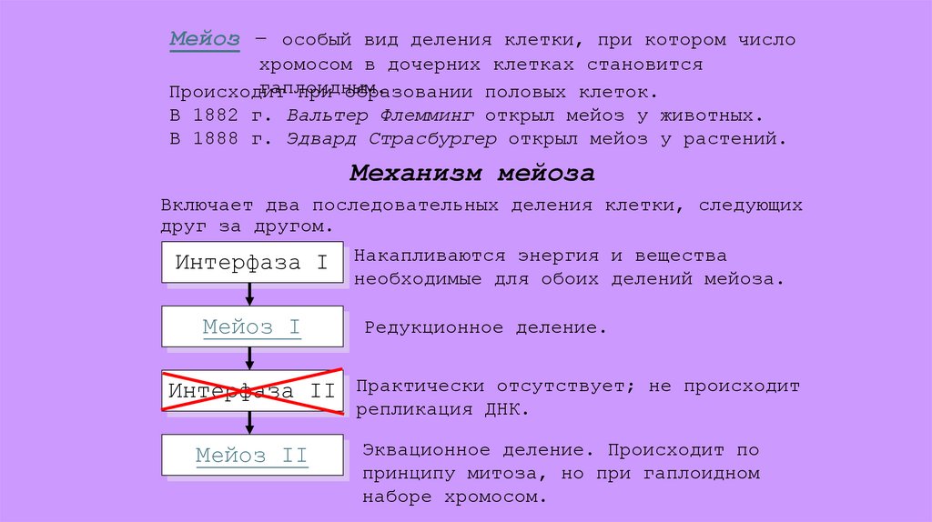 В 1882 г. Вальтер Флемминг открыл мейоз у животных.