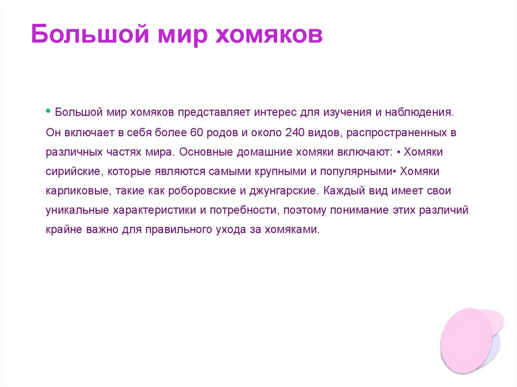 различных частях мира. Основные домашние хомяки включают: • Хомяки