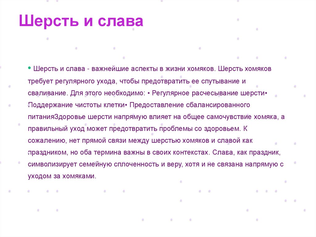 Шерсть и слава• Шерсть и слава - важнейшие аспекты в жизни хомяков. Шерсть хомяков