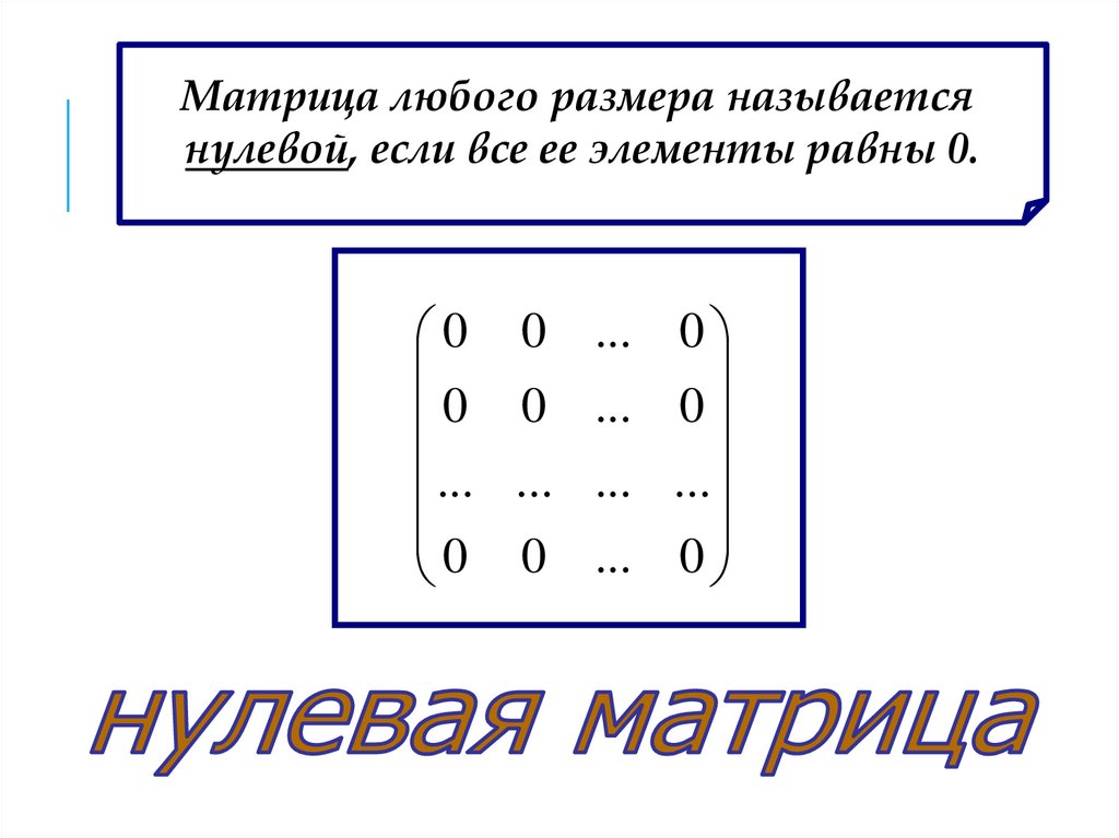 Матрица любого размера называетсянулевой, если все ее элементы равны 0.
