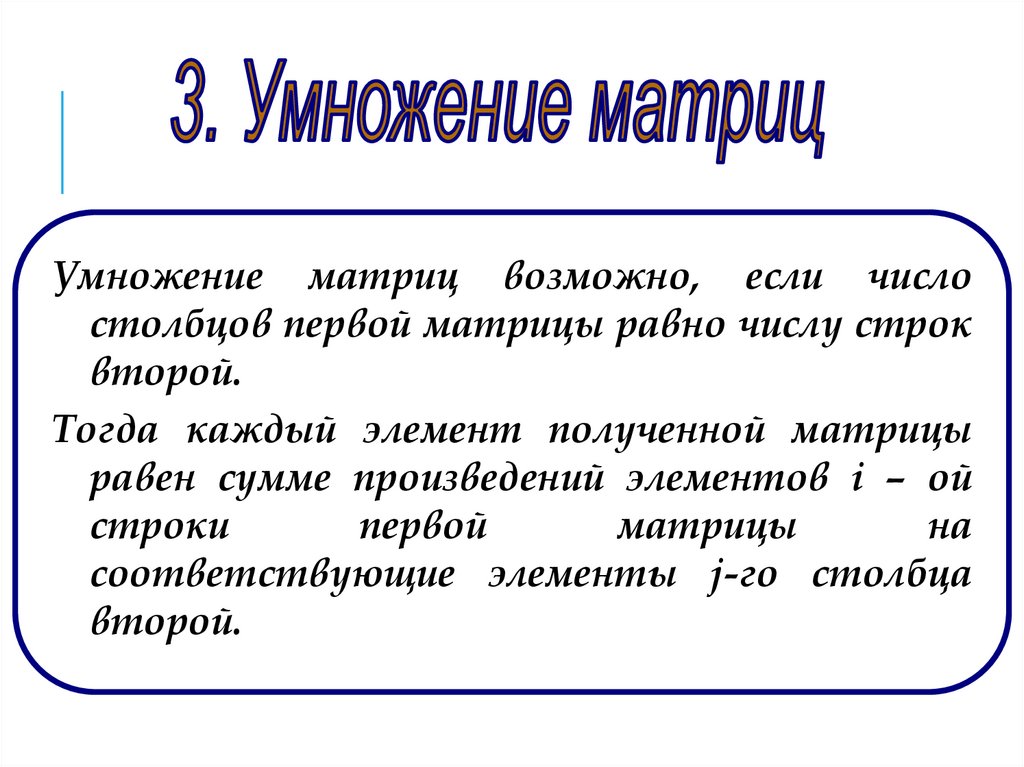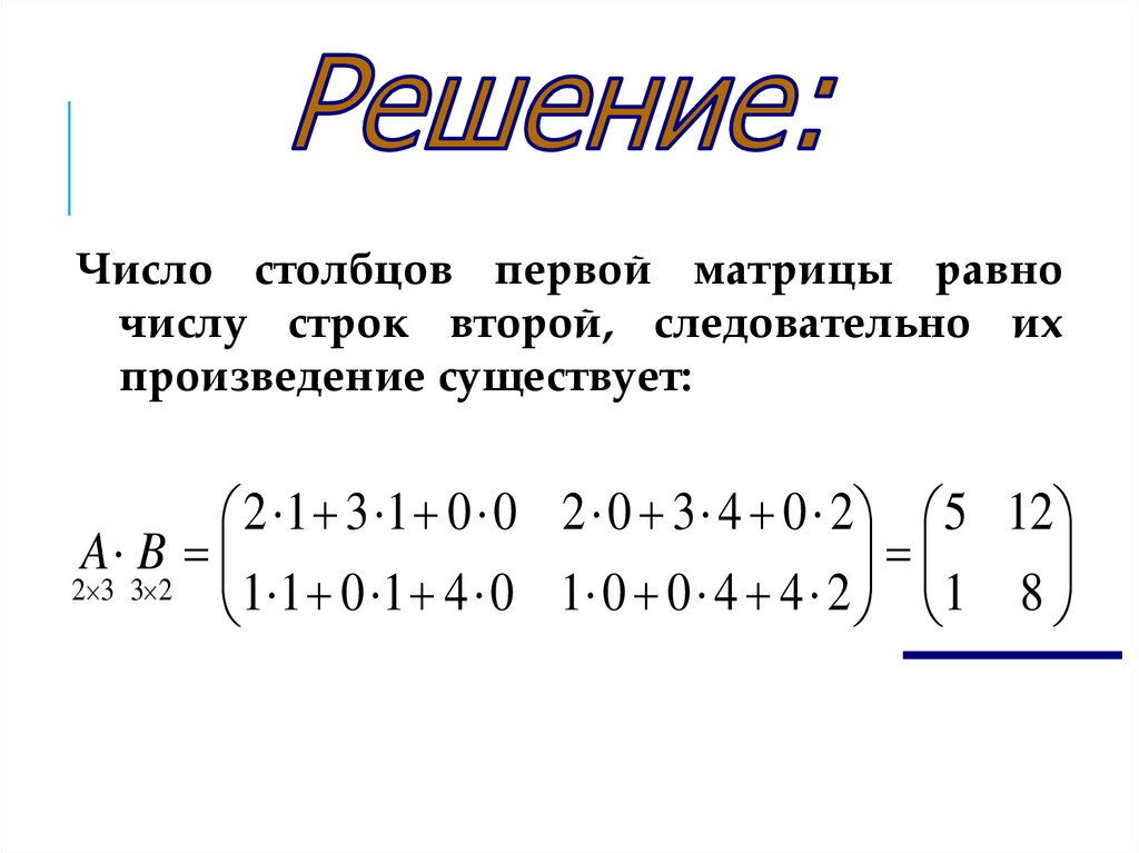 Умножение матриц возможно, если числостолбцов первой матрицы равно числу строк