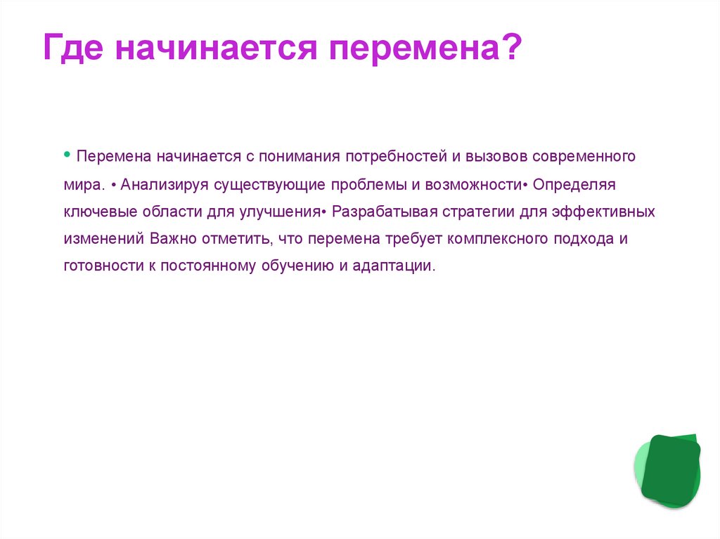 Где начинается перемена?• Перемена начинается с понимания потребностей и вызовов современного