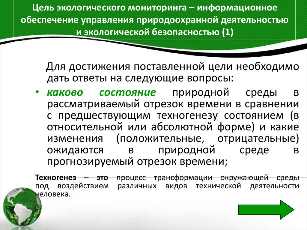 Цель экологического мониторинга – информационноеобеспечение управления природоохранной деятельностью