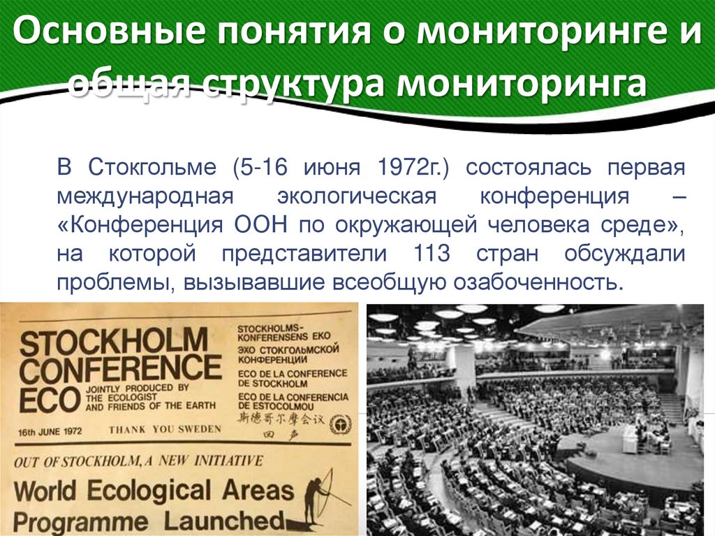 Понятие мониторинга окружающей среды было впервые введенов 1972 г. на Стокгольмской конференции ООН.