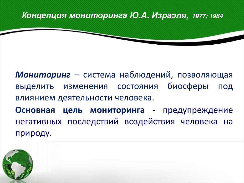 Концепция мониторинга Ю.А. Израэля, 1977; 1984Мониторинг – система наблюдений, позволяющая