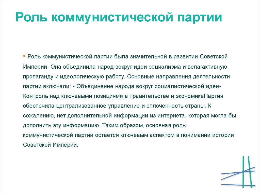 Роль коммунистической партии• Роль коммунистической партии была значительной в развитии Советской