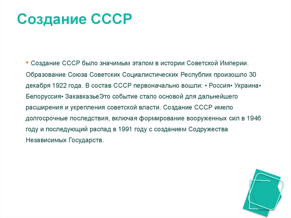 Создание СССР• Создание СССР было значимым этапом в истории Советской Империи.