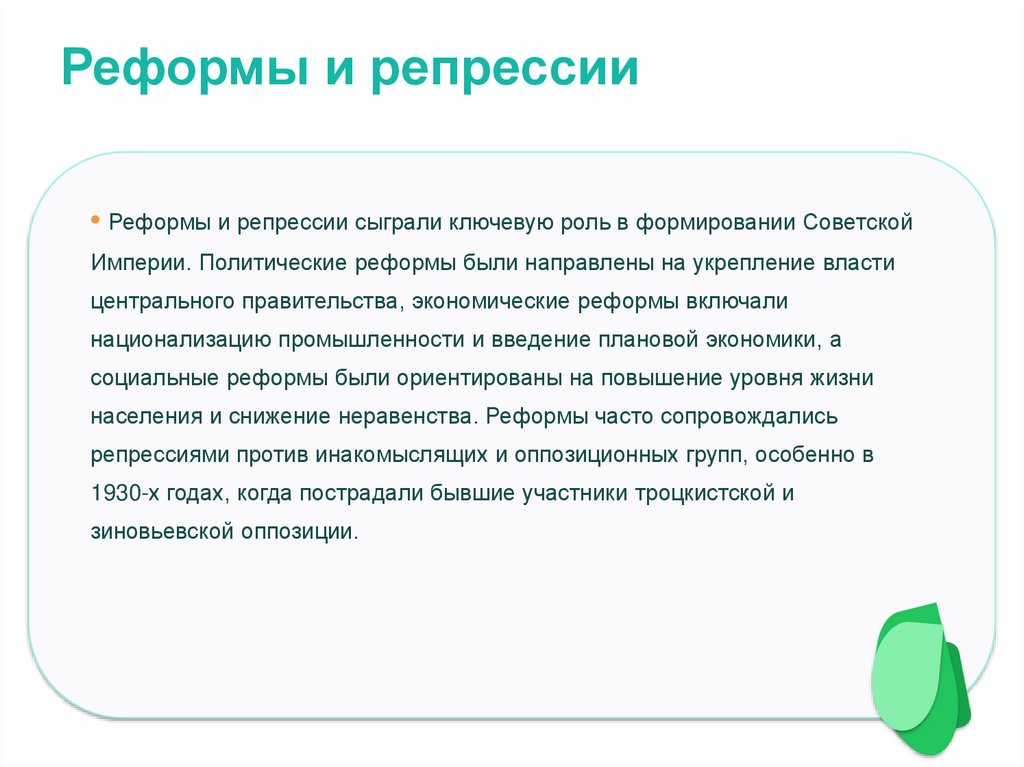 Реформы и репрессии• Реформы и репрессии сыграли ключевую роль в формировании Советской