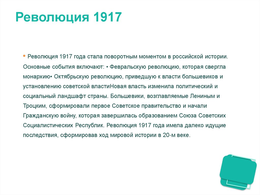 Революция 1917• Революция 1917 года стала поворотным моментом в российской истории.