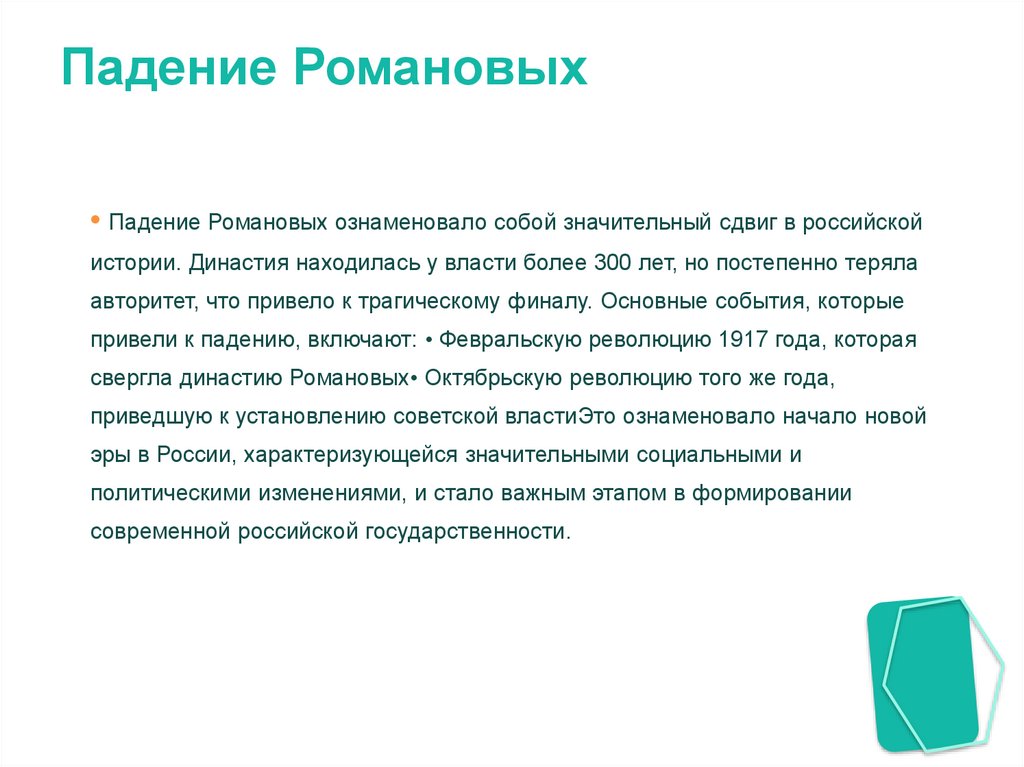 Падение Романовых• Падение Романовых ознаменовало собой значительный сдвиг в российской