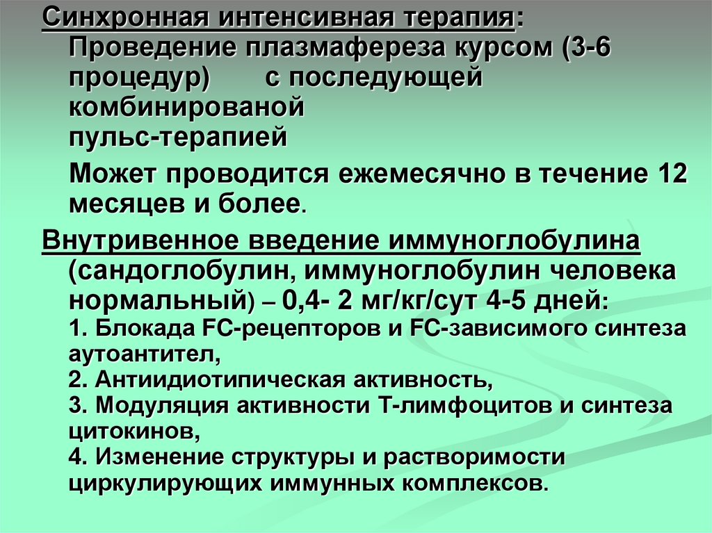 Синхронная интенсивная терапия:Проведение плазмафереза курсом (3-6