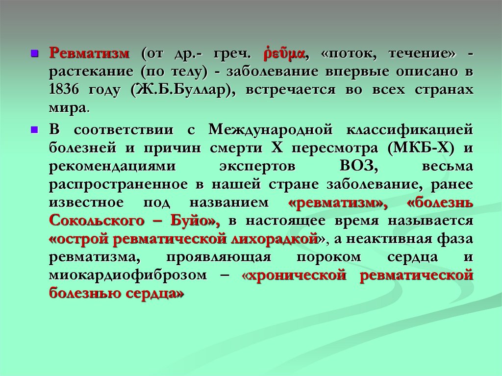 Ревматизм (от др.- греч. ῥεῦμα, «поток, течение» растекание (по телу) - заболевание впервые описано в1836 году (Ж.Б.Буллар), встречается во всех странах