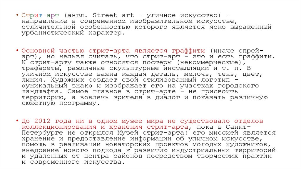 • Стрит-арт (англ. Street аrt - уличное искусство) направление в современном изобразительном искусстве,отличительной особенностью которого является ярко выраженный