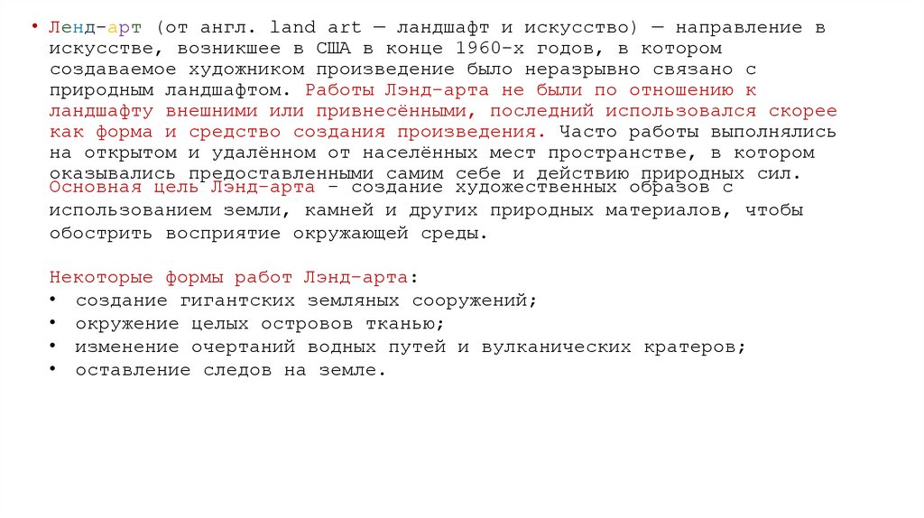• Лэнд-арт (от англ. land art — ландшафт иискусство) — направление в искусстве, возникшее