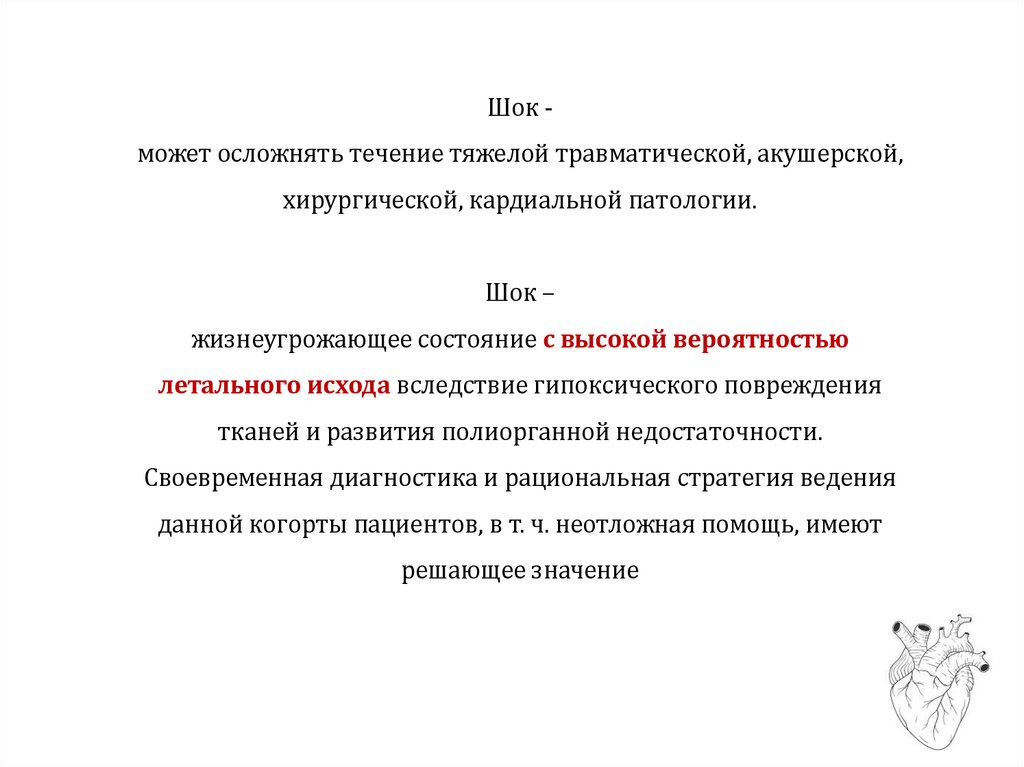 Шок может осложнять течение тяжелой травматической, акушерской,хирургической, кардиальной патологии.