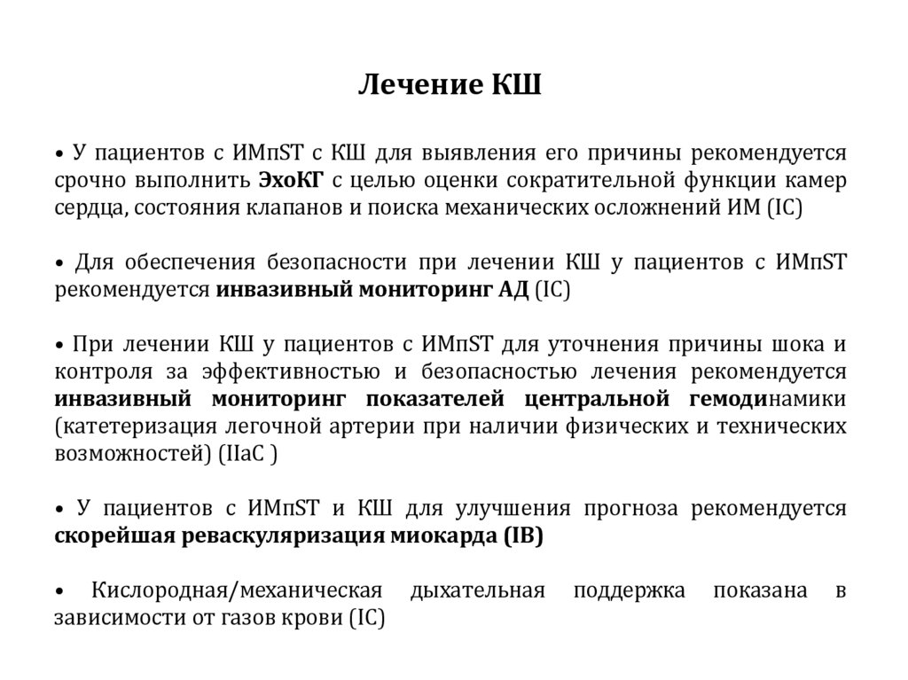 Лечение КШ• У пациентов с ИМпST с КШ для выявления его причины рекомендуется