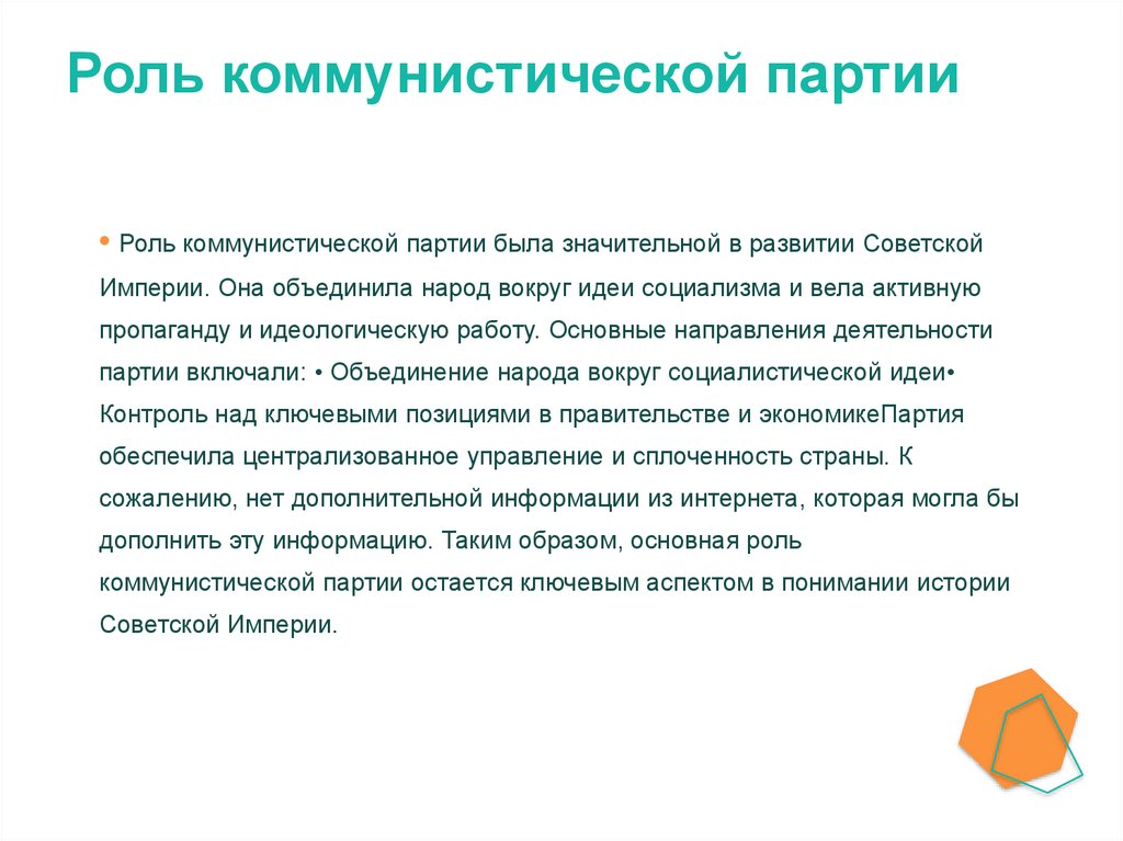 Роль коммунистической партии• Роль коммунистической партии была значительной в развитии Советской