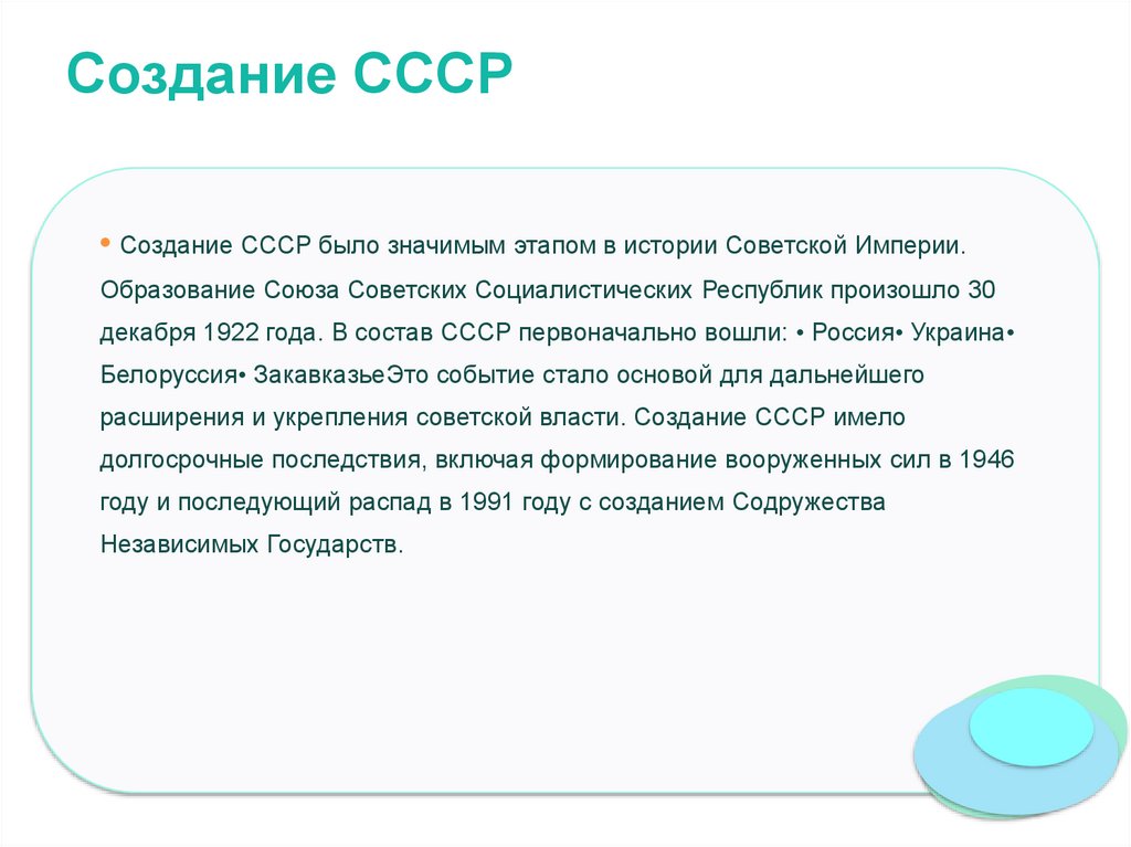 Создание СССР• Создание СССР было значимым этапом в истории Советской Империи.