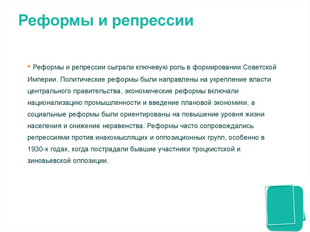 Реформы и репрессии• Реформы и репрессии сыграли ключевую роль в формировании Советской