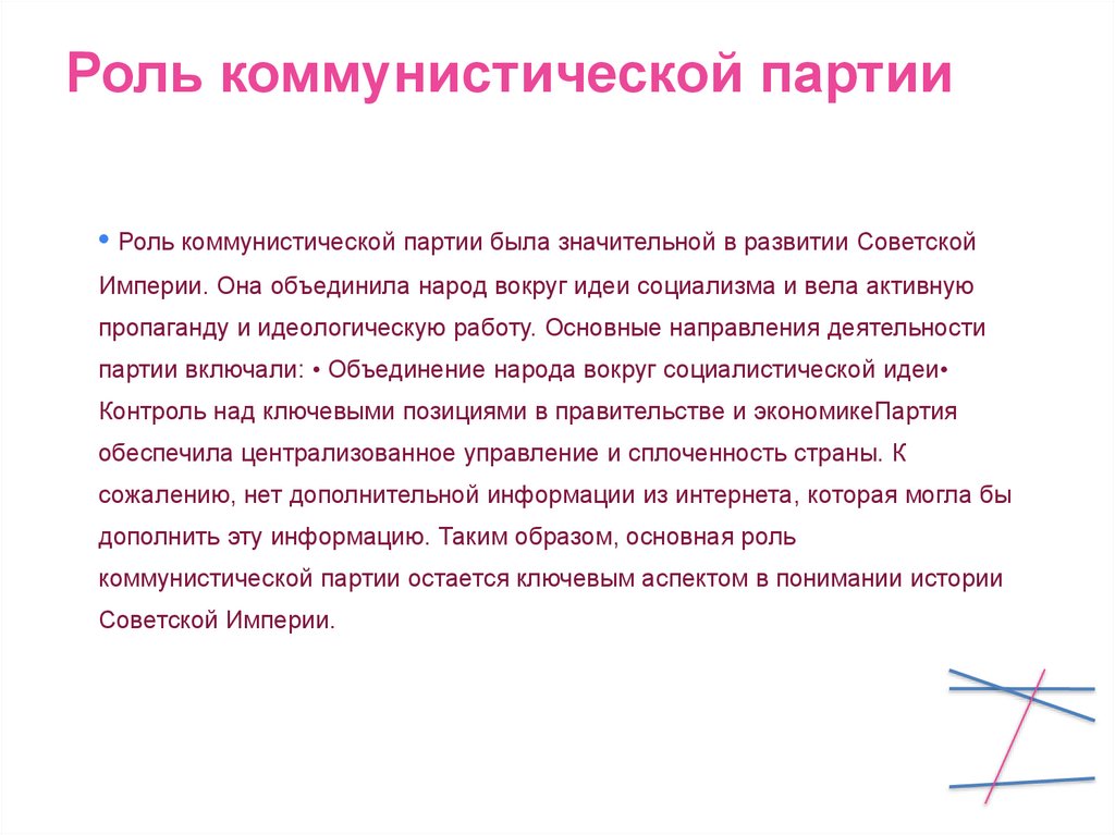Роль коммунистической партии• Роль коммунистической партии была значительной в развитии Советской