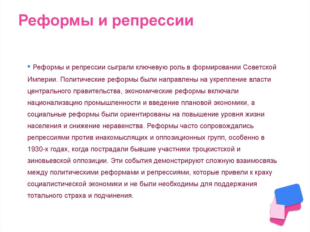 Реформы и репрессии• Реформы и репрессии сыграли ключевую роль в формировании Советской