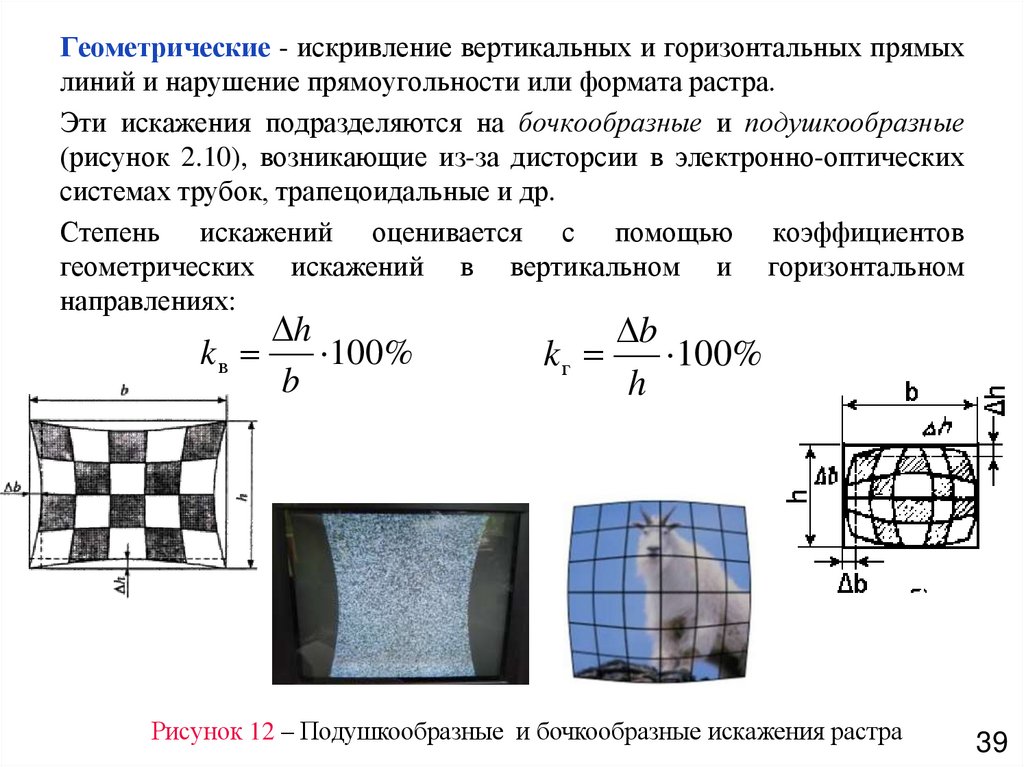 Геометрические - искривление вертикальных и горизонтальных прямыхлиний и нарушение прямоугольности или формата растра.