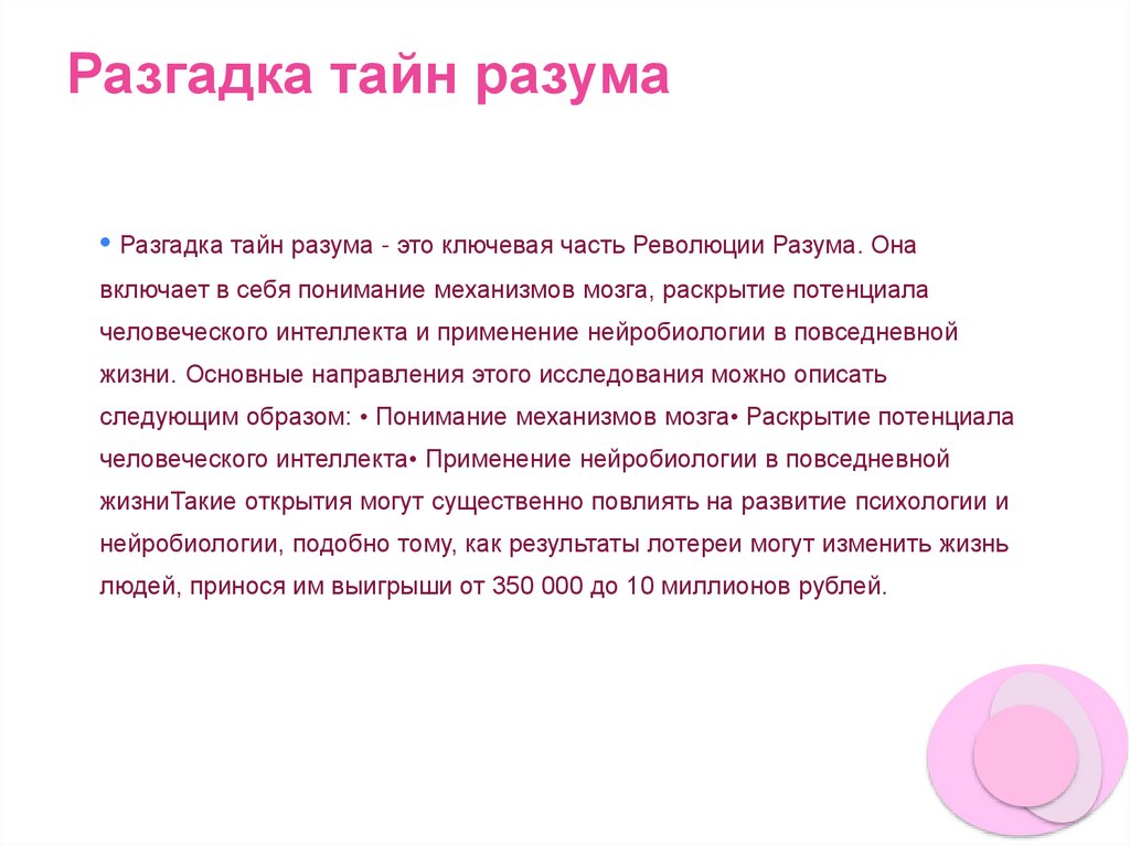 Разгадка тайн разума• Разгадка тайн разума - это ключевая часть Революции Разума. Она