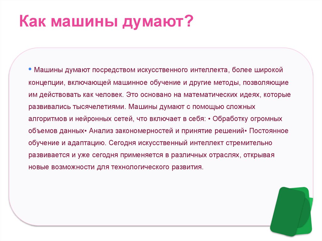 Как машины думают?• Машины думают посредством искусственного интеллекта, более широкой