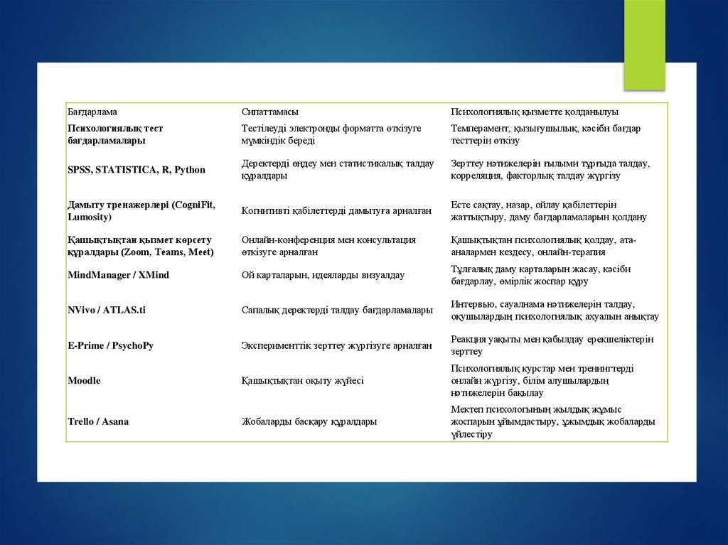 • Психодиагностикалық тест бағдарламалары• Статистикалық талдау құралдары