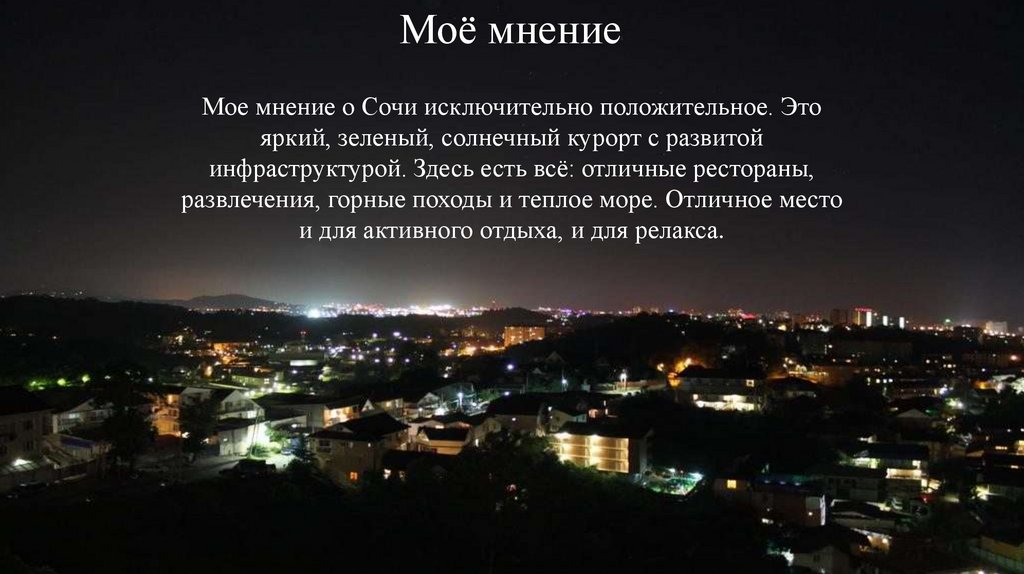 Моё мнениеМое мнение о Сочи исключительно положительное. Это