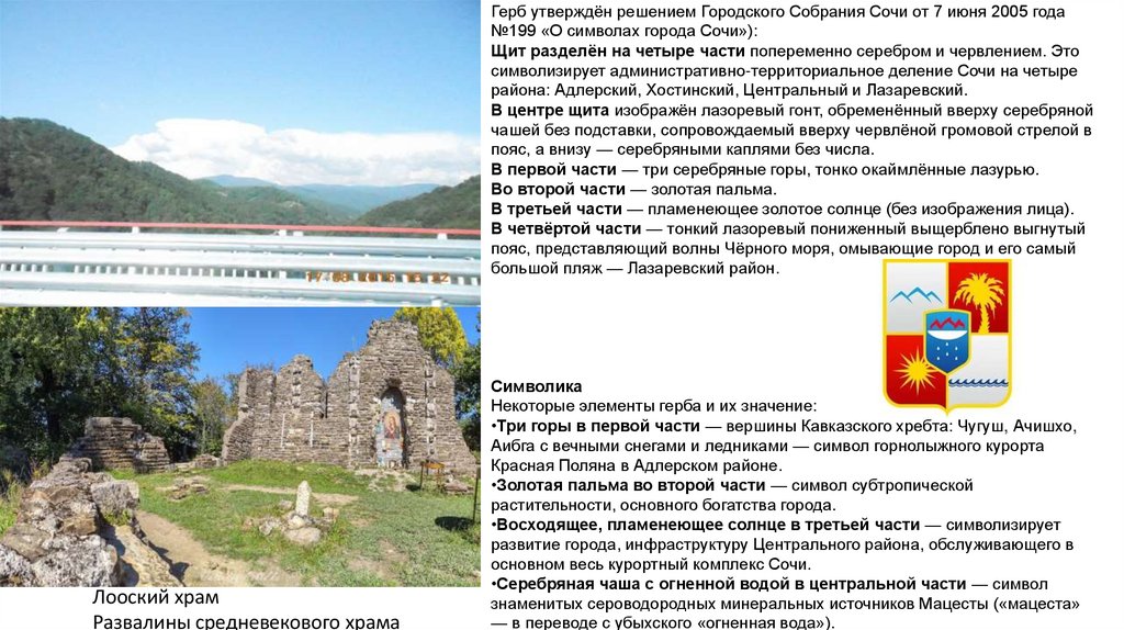Герб утверждён решением Городского Собрания Сочи от 7 июня 2005 года№199 «О символах города Сочи»):
