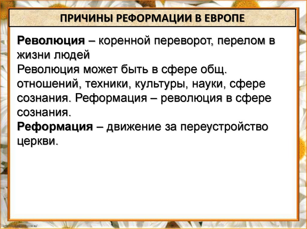ПРИЧИНЫ РЕФОРМАЦИИ В ЕВРОПЕРеволюция – коренной переворот, перелом в
